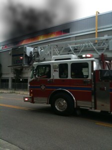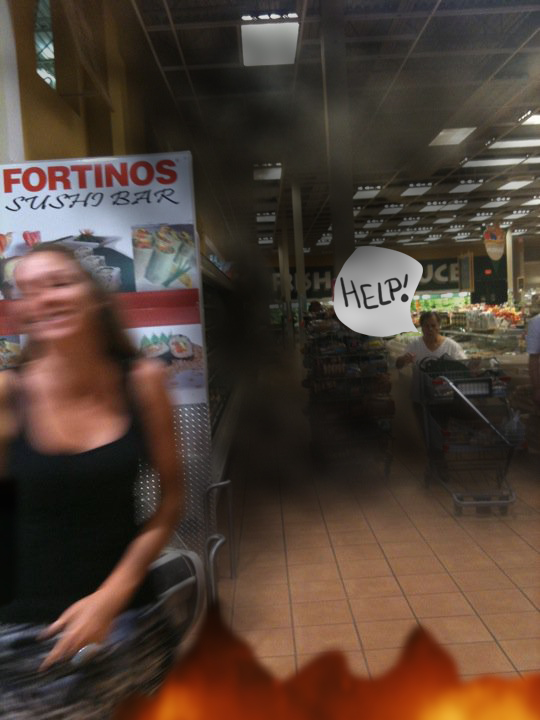 As we approached Fortinos we noticed a strange noise coming from the building.  Some might say it sounded exactly like a fire alarm.  We decided that we really needed hummus so we continued on, ignoring the earth shattering noise.  We got to the top of the escalater and witnessed pure chaos.  Grown men in tears. Women were frantically running toward the exits.  Several small children were rolling around in flames.  Fortino’s was on fire and we were literally at the heart of it all.  Being the extreme bloggers that we are we decided even in the midst of the crazyness we had to capture the moment on camera.  We took this picture before being carried out by firemen and given CPR.