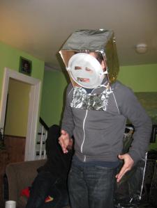 Sometimes peter wears a robot hat. well really it’s more like a mask/helmet. we really haven’t gotten past robots yet. we totally missed the whole vampire thing, and now we’re way behind this zombie craze.  maybe we can catch up in time for the next fad. i’m crossing my fingers it will have something to do with tony danza.